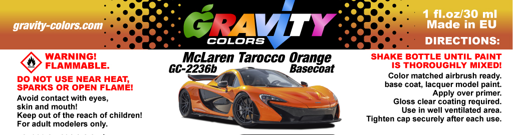 - Then apply GC-2236b McLaren Tarocco Orange Basecoat over the GC-2236a McLaren Tarocco Orange Undercoat once it is dry.